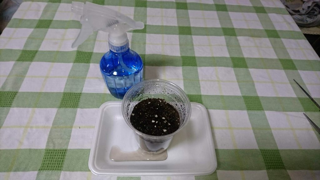 この後霧吹きをするので、下に受け皿(写真ではトレー)を置いておくと良いです。