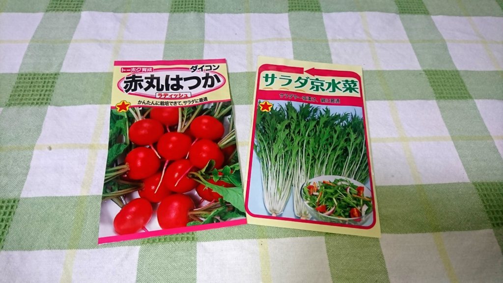 ラディッシュ(赤丸はつか大根)と水菜(サラダ京水菜)を選びました。